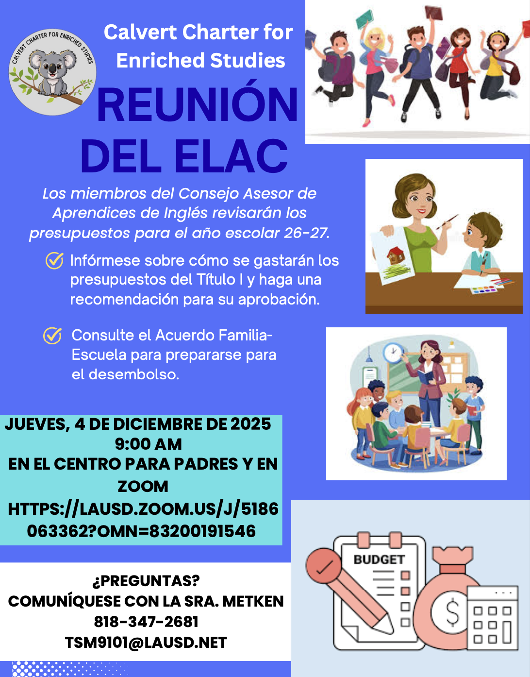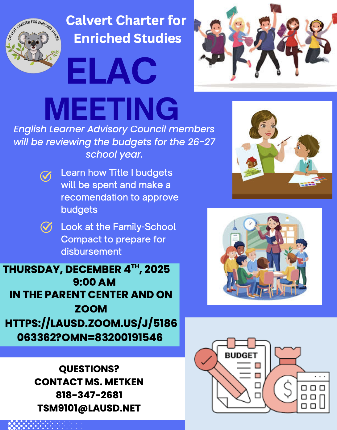 Our next ELAC meeting will be Thursday, December 4th, 2025 at 9am. This will be a budget meeting to prepare for the next school year (2026-2027).
