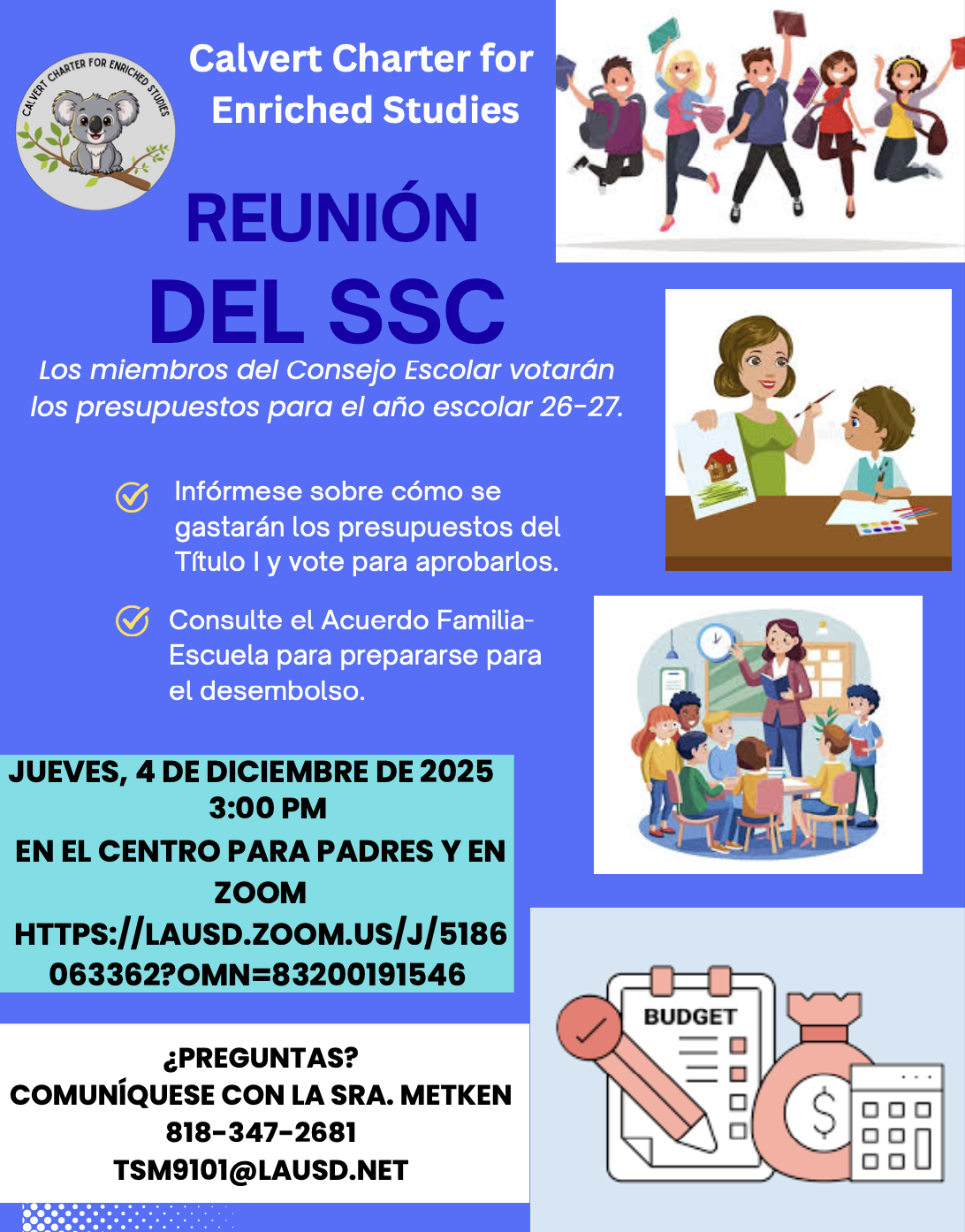 Our next SSC meeting will be Thursday, December 4th, 2025 at 3pm. This will be a budget meeting to prepare for the next school year (2026-2027).